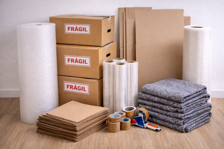 Cajas, film, mantas, burbuja y cinta. Te lo llevamos o lo incluimos en el servicio.