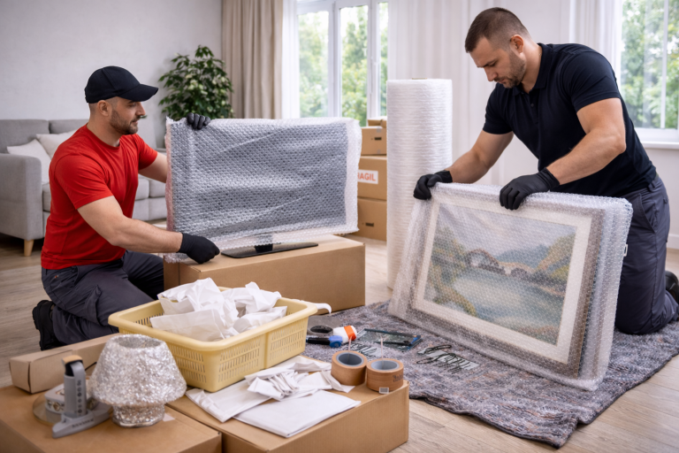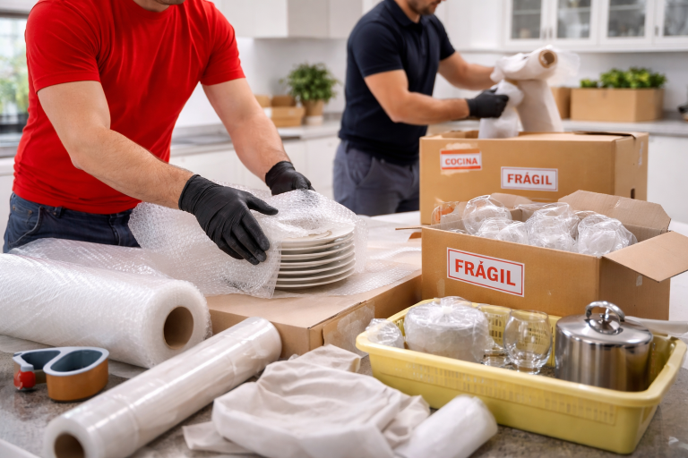 Protegemos cocina, cristalería y objetos frágiles con material profesional.